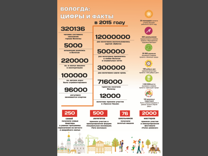 Вологжане воспользовались картой «Забота» в 2015 году 12 миллионов раз. Итоги года в цифрах и фактах подвели в областной столице. Так, население города в 2015 году составило более 320 тысяч человек, в Вологде родилось 5000 младенцев, введено в строй 220 тысяч квадратных метров жилья и отремонтировано 100 тысяч квадратных метров дорог. Кроме того, 250 семей получили новое жилье в рамках выполнения программы по переселению из ветхих и аварийных домов. За год Вологду также посетили 716 тысяч туристов, и почти каждый житель города сдал свою кровь — 300 тысяч человек.