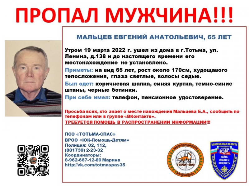 Всех, кто знает о местонахождении тотьмича, просят обратиться по телефонам или в сообщении в группе поискового отряда, сообщает ИА «СеверИнформ».