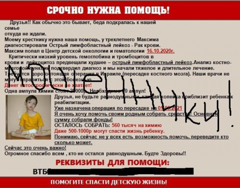 Это очередной обман. Прежде, чем переводить деньги, убедитесь в упоминании всех данных о ребенке, которому идет сбор, позвоните в банк и уточните номер счета и его назначение. Не переводите деньги мошенникам, сообщает ИА "СеверИнформ".
