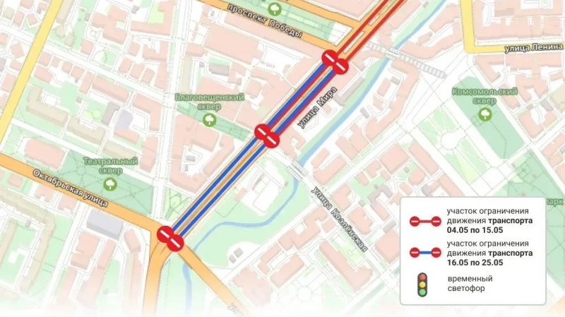 Дорога будет закрыта для проезда автомобилей на отрезке от перекрестка улиц Мира и Козленская до перекрестка улиц Мира и Сергея Орлова. Однако проезд непосредственно через сами перекрестки останется открытым.