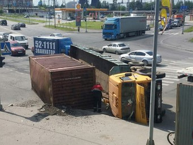 Как сообщают очевидцы, грузовик поворачивал и торопился завершить маневр, однако не рассчитал скорость и опрокинулся на бок.