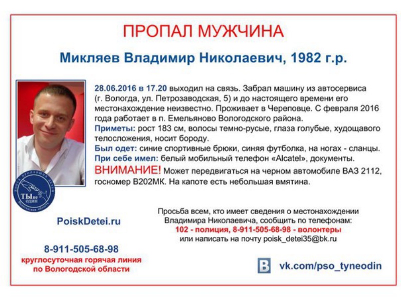 В Вологде пропал 34-летний Владимир Микляев. Последний раз мужчина выходил на связь 28 июня в 17:20. В тот же день Владимир Микляев забрал свой автомобиль из автосервиса в Вологде по улице Петрозаводской, 5, и до сих пор о нём ничего неизвестно.