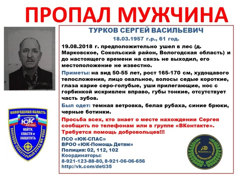 Пропавшего пожилого мужчину разыскивают в Сокольском районе. По информации поисково-спасательного отряда «ЮК-СПАС», 61-летний Турков Сергей Васильевич ушел из дома в деревне Марковское 19 августа, предположительно он направлялся в лес. С этого момента о судьбе пенсионера ничего не известно.