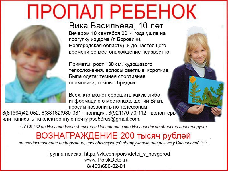 За предоставление любой информации, которая поможет в поиске девочки, предусмотрено вознаграждение в размере 200 тысяч рублей. Всем, кто что-то знает о местонахождении Вики Васильевой, просьба позвонить по указанным в ориентировке номерам.