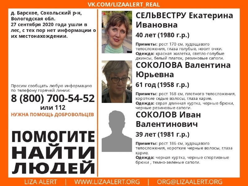 Поиски трех человек ведутся три дня. 27 сентября в лес ушли Валентина Соколова 61 год, Иван Соколов 39 лет и Екатерина Сильвестру 40 лет.