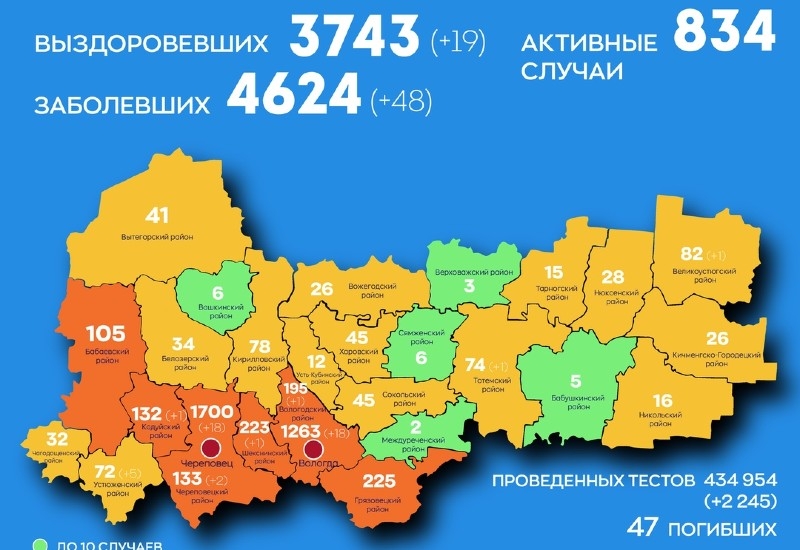 В Вологодской области на сегодня с начала пандемии 4 624 подтвержденных случая коронавирусной инфекции, в том числе за сутки 48 новых случаев: 18 – Вологда, 18 – Череповец, 5 – Устюженский район, 2 – Череповецкий район, и по одному в Вологодском, Тотемском, Великоустюгском, Шекснинском и Кадуйском районах, отмечает областной департамент здравоохранения.