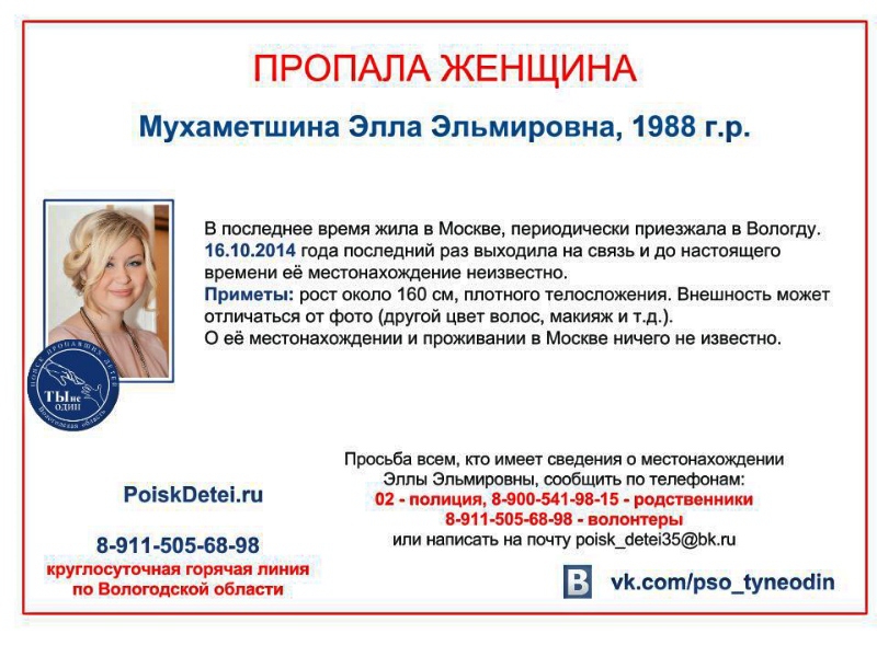 Пропавшую вологжанку разыскивают полиция и волонтеры. 26-летняя Элла Мухаметшина в последнее время жила в Москве, но периодически приезжала в Вологду. Последний раз девушка выходила на связь 16 октября. Сейчас ее местонахождение неизвестно.