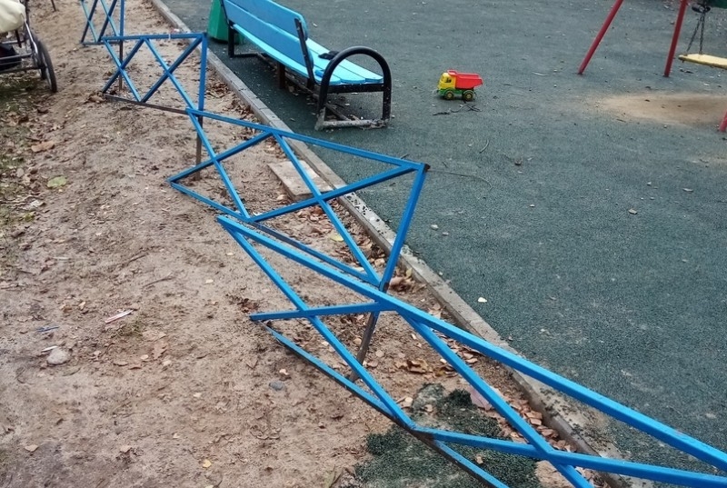 "Это детская площадка на Октябрьской улице, напротив Спасской гостиницы. Забор разрушен, острые детали торчат, дети запинаются", - написала Ирина Остова.