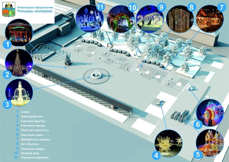 На площади Молодежи задумано 11 развлекательных точек. Помимо самой ели, главного атрибута Нового года, здесь будут звезды, горки, световые шары, ярмарка и много арт-объектов для фотосессий.