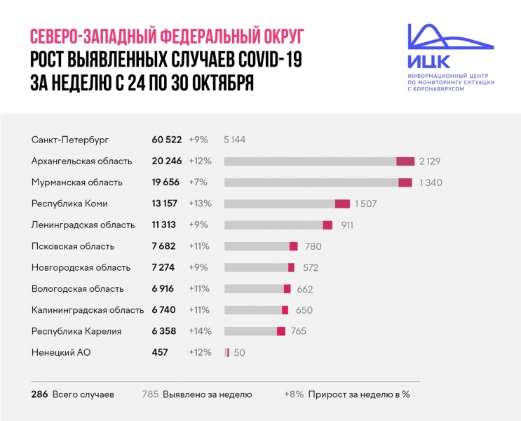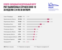 В Новгородской области выявлено 572 новых пациента, в Калининградской - 650. С заметным отрывом "лидирует" Санкт-Петербург, где за 7 дней диагноз подтвердился у более 5 тысяч человек. На втором месте находится Архангельская область с показателем в 2129 пациентов. Данные за период с 24 по 30 октября публикует ИЦК.