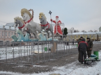 Рядом с елкой поставили объемную фигуру Деда Мороза на тройке лошадей