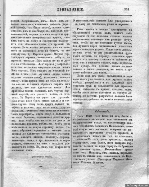 «Сего 1840 года июня 24 дня, был я, отправившись в имение мое, состоящее в Новоржевском уезде, с крепостным своим человеком Василием Павловым, который оттуда того же числа вечером по неизвестным причинам куда-то скрылся, и по розыскам моим нигде не отыскан. Вдов, 24 лет, роста среднего, волосы темно-русые, лицо белое, нос немного горбоват, одежда на нем сюртук с брюками из тонкого сукна. Покорнейше прошу, если он, Павлов, где явится, переслать ко мне в имение мое…».