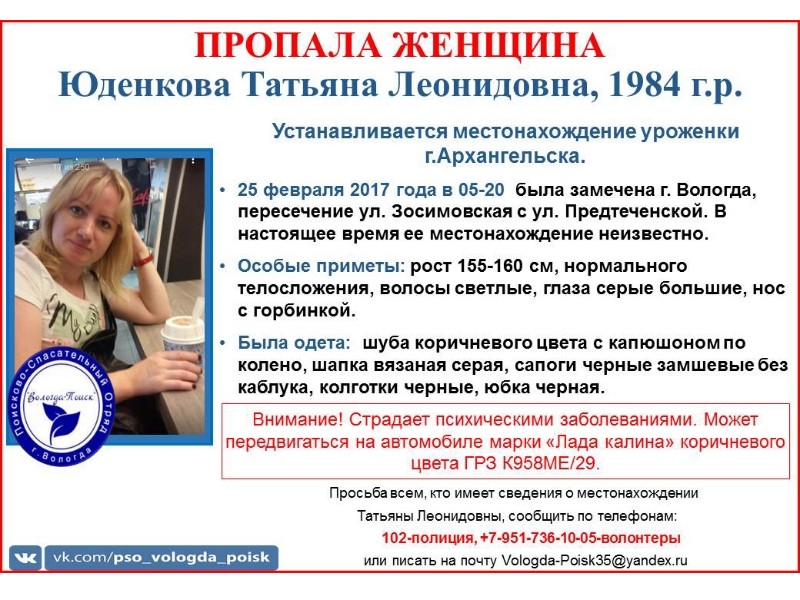 В Вологодской области разыскивают пропавшую Татьяну Юденкову. 33-летнюю жительницу Архангельска последний раз заметили в Вологде 25 февраля на пересечении Зосимовской Предтеченской. Сейчас её местонахождение неизвестно.