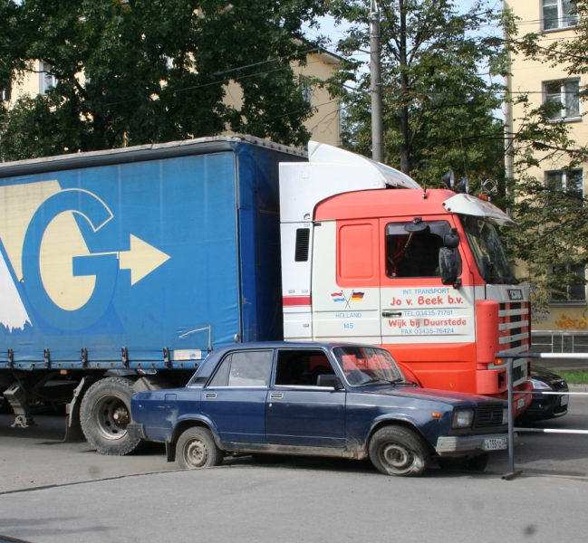 В результате остановившаяся фура полностью перегородила проезд с улицы Предтеченской к стоянке супермаркета, расположенного на перекрестке, кроме того, автомобили по Предтеченской движутся медленно, так как вынуждены объезжать большегруз. При происшествии никто не пострадал, водители столкнувшихся автомашин вызвали сотрудников ГИБДД.
