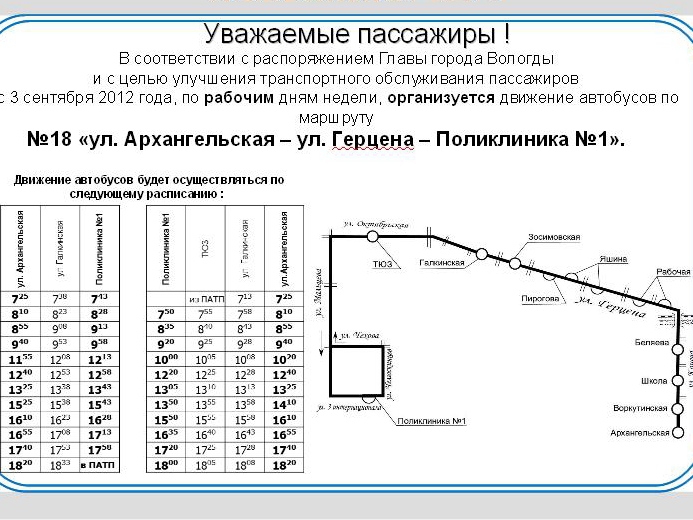 Один из автобусных маршрутов в Вологде изменится. Соответствующее распоряжение дал Глава города Евгений Шулепов с целью улучшения транспортного обслуживания пассажиров. Об этом сообщает ИА «СеверИнформ — Новости Вологды» со ссылкой на ПАТП-1. Автобусы №18 изменят маршрут уже с понедельника, 3 сентября. Движение будет организовано по маршруту «улица Архангельская – улица Герцена – Поликлиника №1». Автобусы будут ходить по рабочим дням недели. Согласно расписанию, первый автобус будет отходить от остановки на улице Галкинской в 7:08, а последний — от остановки на улице Архангельской в 18:20.