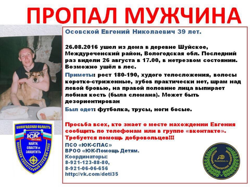 Напомним, Евгений Осовской ушёл из дома в деревне Шуйское 26 августа. В 17 часов его видели последний раз в нетрезвом состоянии.