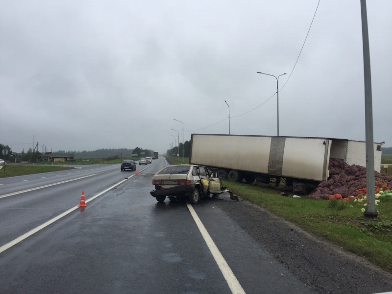 Около 14:00 на 476 километре трассы Москва-Архангельск огромный МАЗ с полуприцепом, груженый овощами, столкнулся с девяткой.