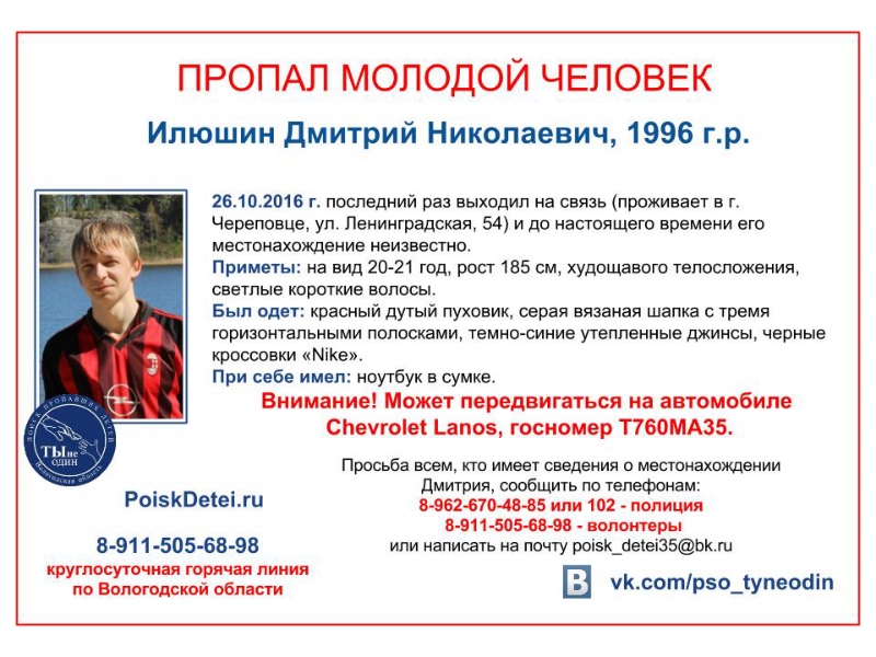 В Череповце разыскивают 20-летнего Дмитрия Илюшина. Последний раз молодой человек выходил на связь 26 октября, с тех пор о нём ничего неизвестно.