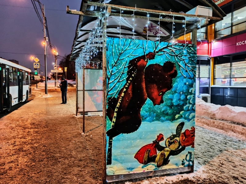 "На остановке "Дом торговли" теперь есть 10-метровый крытый павильон. Да не простой, а новогодний. За предложение оформить остановки в стиле старых праздничных открыток спасибо нашим подписчикам! После подключения гирлянды будет смотреться еще красивее. После праздников новогоднее оформление уберем, остановка будет полностью прозрачной. Добавили новогоднего колорита и старой остановке по улице Набережной. Надеемся, что эти небольшие сюрпризы поднимут вам настроение", - отметил Артем Дмитриев.