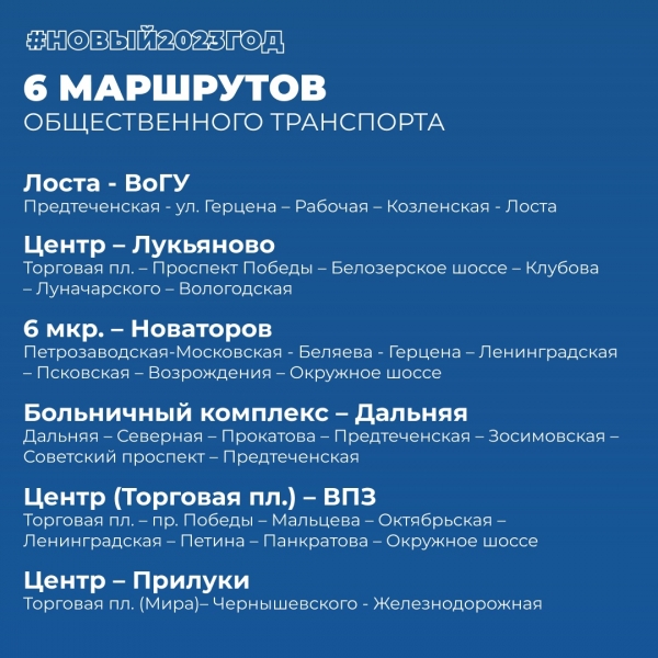 6 маршрутов свяжут отдаленные микрорайоны города: Лоста – ВоГУ, центр – Лукьяново, 6 мкрн – Новаторов, Больничный комплекс – Дальняя, центр – ВПЗ, центр – Прилуки.
