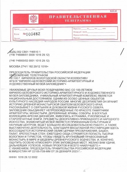 В 2024 году Кирилло-Белозерский музей-заповедник отметит свое столетие. В правительственной телеграмме Мишустин отметил:
