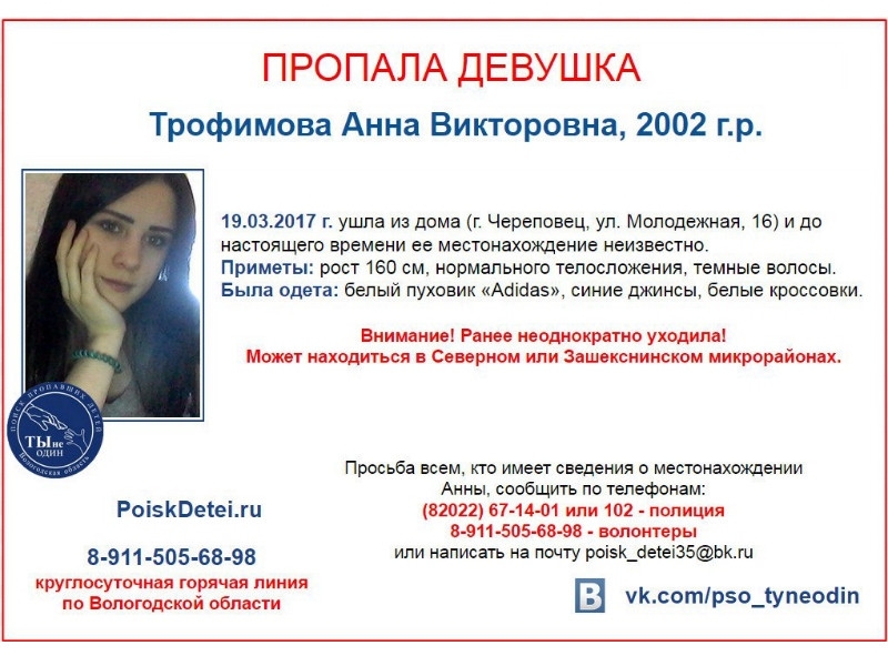 В Череповце разыскивают Анну Трофимову. 15-летняя школьница ушла из дома по улице Молодёжной 19 марта, с тех пор о ней ничего неизвестно.