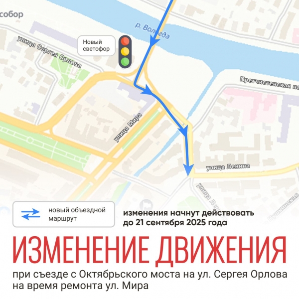 На данном участке уже устанавливается новый светофор, который планируется запустить до конца недели. Левый поворот при съезде с Октябрьского моста позволит автомобилистам объехать ремонтируемый участок ул. Мира через Сергея Орлова, пл. Возрождения и Марии Ульяновой.
