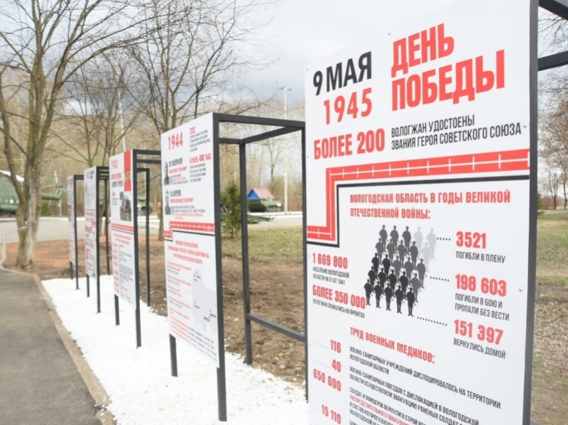 Еще одни новый арт-объект - аллея славы. Это ряд панелей из оцинкованного железа. На них нанесены основные события Великой отечественной войны на территории области, а также размещена информация о героях-вологжанах.