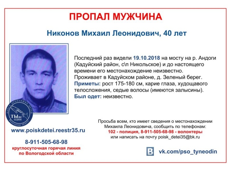 В Кадуйском районе волонтеры, спасатели и полиция разыскивают пропавшего местного жителя. По информации вологодского поисково-спасательного отряда «Ты не один», 40-летний Никонов Михаил Леонидович ушел из дома в деревне Зеленый берег, в последний раз его видели на мосту через реку Андога в Никольском поселении 19 октября. С тех пор его местонахождение остается загадкой.