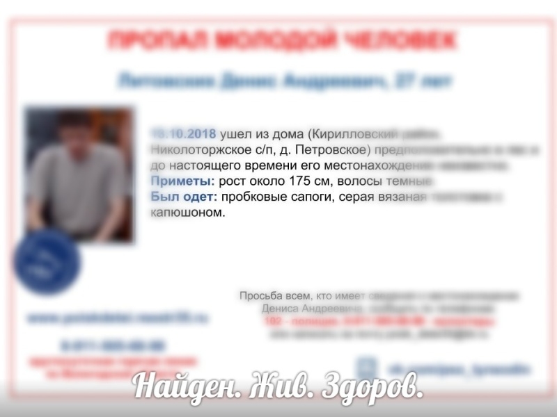 27-летний Денис Литовских, который пропал в лесах Кирилловского района, найден живым и здоровым. Напомним, парень ушел из деревни Петровское 13 октября,...