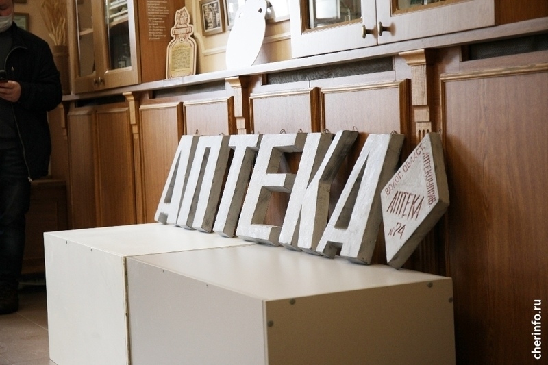 Как пишет сherinfo.ru со ссылкой на директора музейного объединения Светлану Султанову, многие гости города обращают внимание на эту вывеску. Она сделана примерно в 1956 году, когда упразднили межрайонную контору, все аптеки перешли в Вологодское аптечное управление.