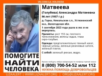 Последний раз женщина выходила на связь вечером 1 сентября, и на следующий день она собиралась в лес за грибами. Более точной информации нет. 10 сентября к поискам были подключены поисковики отряда «Лиза Алерт». Поисковыми группами в лесу пройдено более 40 км. Накануне в поисках Александры Матвеевой работала полиция совместно с добровольцами ПСО «Азимут», «Лизы Алерт».