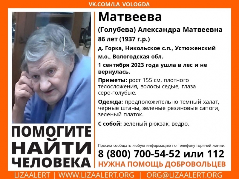 Примерно 2 сентября в Устюженском районе в деревне Горка пропала Александра Матвеева.