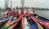 Такое необычное зрелище под новый год подарила своим землякам компания друзей. Любители сплавляться по рекам, они решили воспользоваться тем, что этой зимой река Колпь так и не встала. Взяв байдарки, друзья нарядились в костюмы Дедов Морозов и в таком виде проплыли по реке.