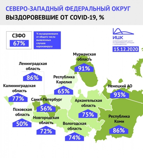 По данным на 15 декабря, в регионе из 17619 заболевших выписали 13031 человека. Доля выздоровевших составила 74%. По данным ИЦК, это один из самых низких показателей в СЗФО.