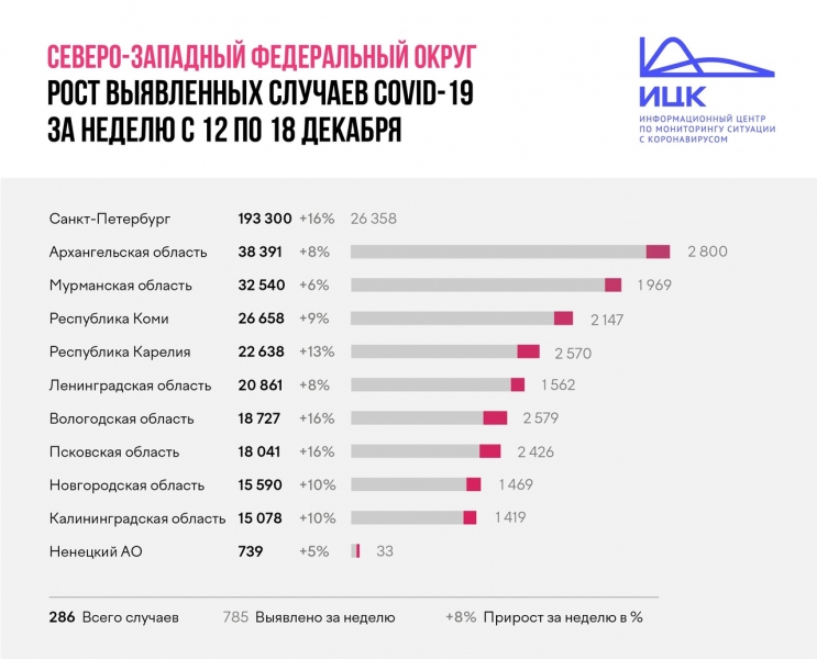 За неделю с 12 по 18 декабря диагноз "коронавирус" поставили 2579 людям. БОльшие показатели только в Санкт-Петербурге и Архангельской области - 26358 и 2800 новых случаев. Такие данные публикует ИЦК.
