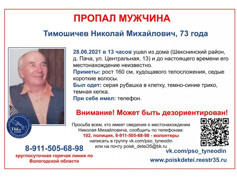 Требуются волонтеры для поисков. 73-летний Николай Тимошичев ушел из дома в деревне Пача около 13 часов 28 июня. С тех пор местонахождение мужчины неизвестно.