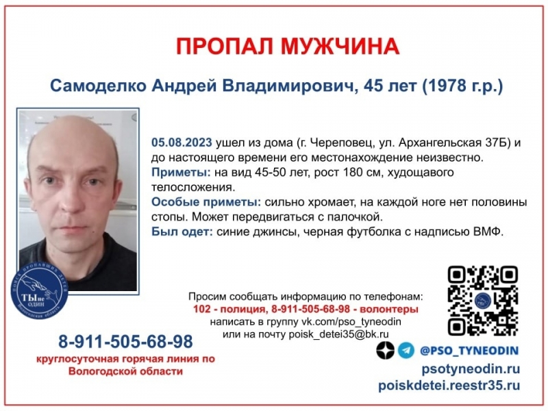 ПСО «Ты не один» публикует приметы пропавшего. Мужчина ростом 180 сантиметров, худощавого телосложения. На каждой ноге нет половины стопы, поэтому сильно хромает, возможно, ходит с тростью. Был одет в синие джинсы, черную футболку с надписью ВМФ.