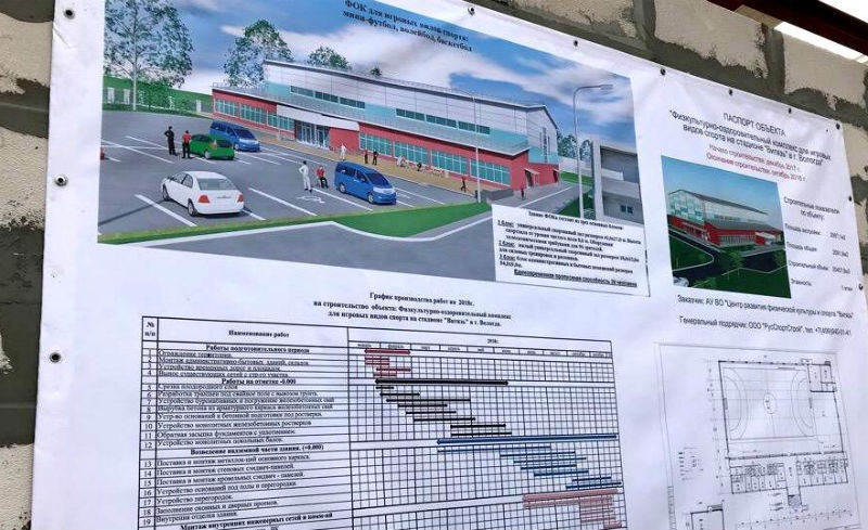 Полный запуск объекта запланирован на начало декабря. На строительство ФОКа «Витязь» в этом году выделено 115 миллионов рублей. Фундаменты уже залиты, подведены сети – вода, тепло и электричество. Сейчас на объекте трудится порядка 20 человек, не считая спецтехники, пишет «Вологда.РФ». В здании спорткомплекса идет просушка помещений, отделка душевых, раздевалок и кабинетов.
