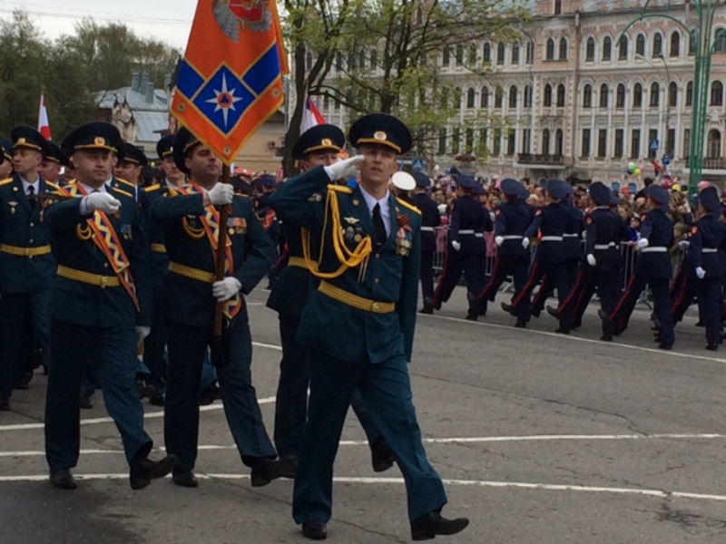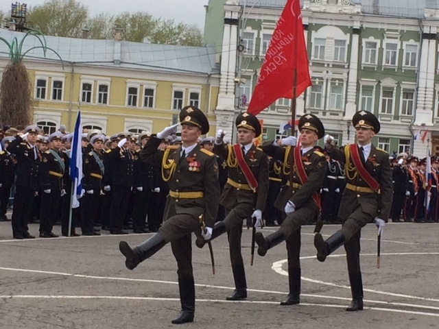Ровно в 10 утра на площадь Революции была вынесена копия Знамени Победы - штурмового флага 150-й ордена Кутузова II степени Идрицкой стрелковой дивизии, который 1 мая 1945 года был водружен над Рейхстагом в Берлине.