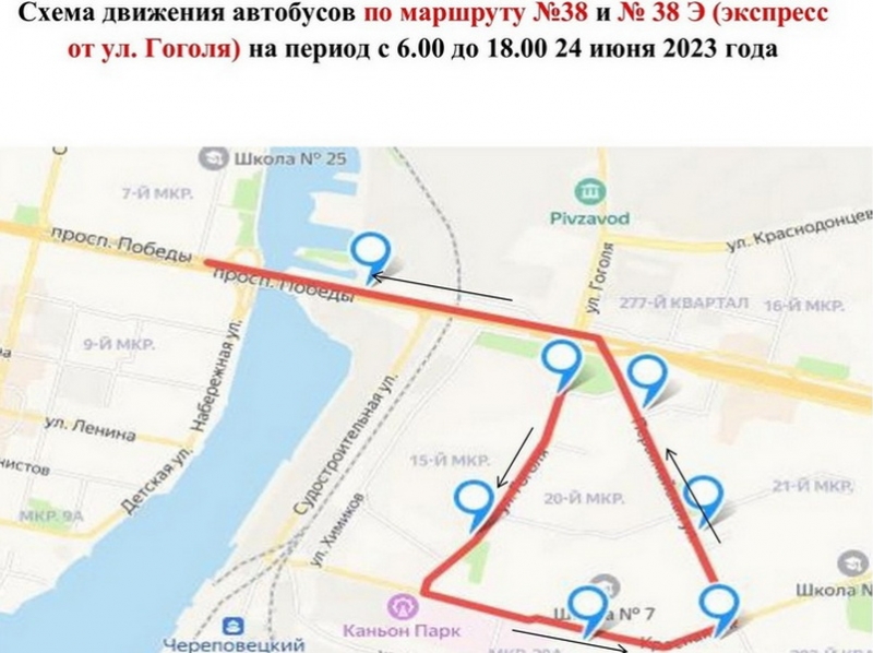 Автобусы № 7 и 31 объедут Архангельскую по Юбилейной и проспекту Победы. Машины № 38 завернут с проспекта Победы на Гоголя, оттуда на Красную, а затем на Первомайскую. Экспресс № 38 пойдет по улицам Гоголя, Красной и Первомайской, по проспекту Победы, Олимпийской, Командарма Белова и Юбилейной, пишет cherinfo.