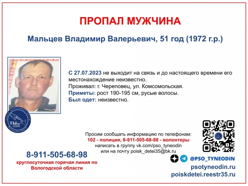Горожанин не выходит на связь с 27 июля. 51-летний череповчанин проживал на улице Комсомольской. Местонахождение сейчас неизвестно. ПСО «Ты не один»...