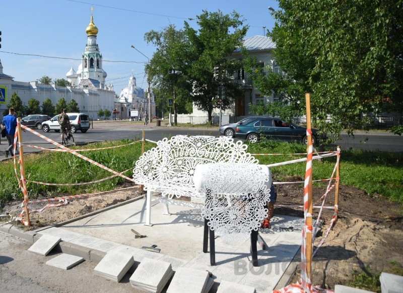 Его установкой занимается подрядная организация ООО «Оптстрой». Рядом со скамейкой будет стоять кружевной станок с незаконченной салфеткой с надписью «Вологда». Как пояснили в администрации, место объекта было выбрано не случайно, сидя на скамье прекрасно видно колокольню и купола Софии.