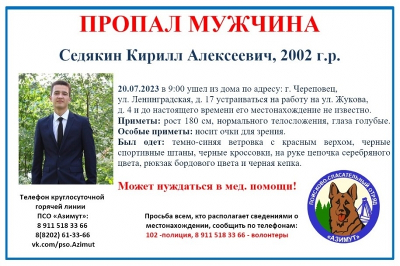 21-летний житель Нюксеницы приехал в Череповец для трудоустройства. 20 июля юноша ушел из Зашекснинского района на потенциальную работу. С тех пор молодой человек не выходит на связь. Поисковые отряды опубликовали ориентировки для поиска пропавшего. Кроме того, решено искать парня а местности.