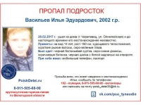 В Череповце пропал подросток Фото:vk.com/pso_tyneodin