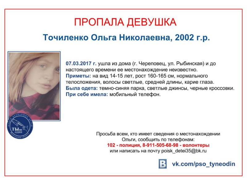 Пропавшую в Череповце школьницу разыскали Фото:vk.com/pso_tyneodin
