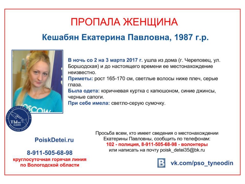 В Череповце пропала Екатерина Кешабян. 30-летняя женщина ушла из дома по улице Боршодской в ночь со 2 на 3 марта. До сих пор её местонахождение неизвестно.
