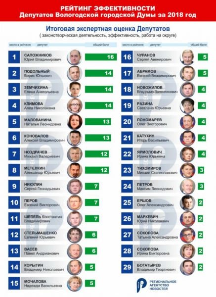 ИА "Ранпресс" решило составить рейтинг эффективности городских депутатов Вологды. Эффективность народных избранников оценивалась по пяти критериям.