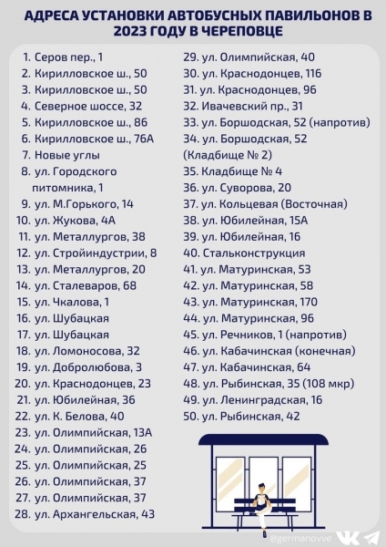 Добавим, всего в Череповце насчитывается 332 остановки. Из них 284 автобусных и 48 трамвайных. В рамках городской программы установлен 161 павильон. Работа продолжится, сообщает ИА «СеверИнформ».