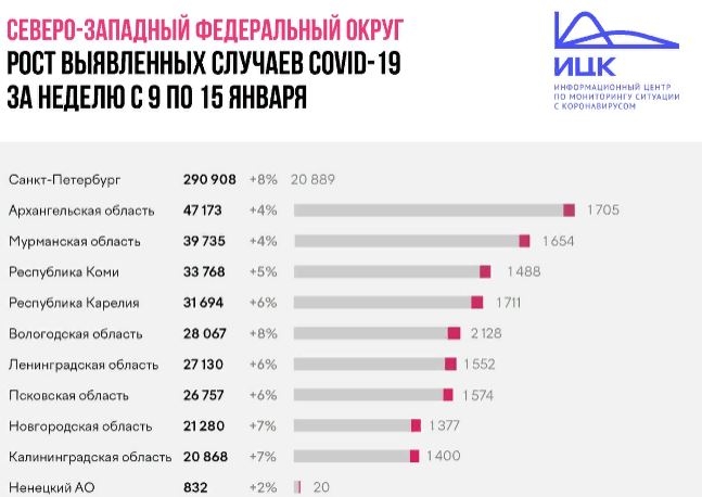 Общее количество пациентов превысило 28 тысяч человек. С 9 по 15 января диагноз "коронавирус" поставлен 2182 людям. Таким образом, прирост составил 8%. Это наибольший показатель в СЗФО, как и в Санкт-Петербурге. Таковы данные ИЦК.
